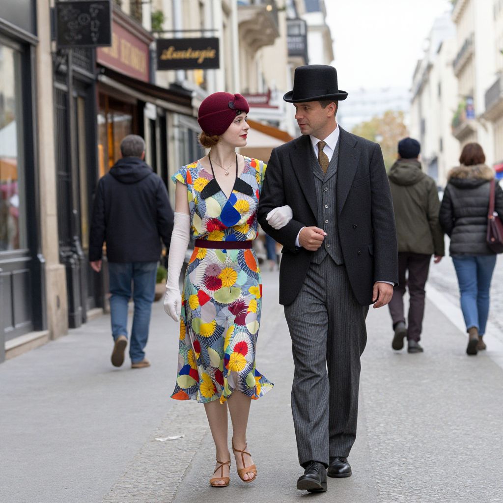 Elegant couple strolling arm-in-arm down a bustling Parisian street, dressed in vibrant 1920s attire, with the woman in a floral dress and red beret and the man in a formal suit and top hat, as other pedestrians walk in the background near storefronts and signage.