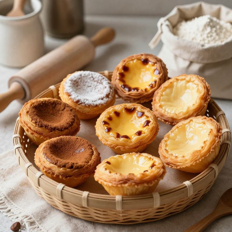 A basket filled with an assortment of Pasteis de nata, some dusted with cinnamon and others plain, surrounded by rustic kitchen tools like rolling pins and flour sacks, warm and inviting bakery kitchen vibe with soft morning light emphasizing texture and color.