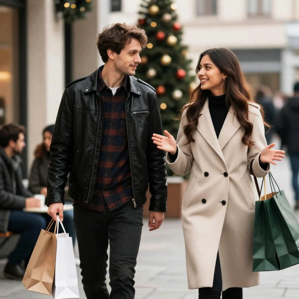 Photograph of a smiling couple standing outside a store window. Man with short brown hair, blue jacket, and plaid shirt. Woman with long red hair, blue jacket, red and white patterned scarf, pointing at the window. Background with Christmas decorations and blurred people. Daylight.