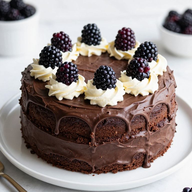 Quick Blackberry Chocolate Cake topped with chocolate frosting, whipped cream and fresh blackberries