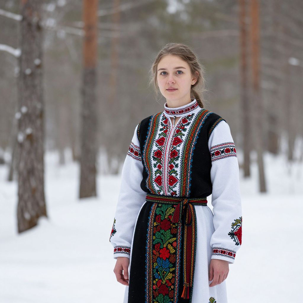 Photograph of a young Caucasian woman with light brown hair in a forest during winter. She wears a traditional Eastern European folk dress, featuring a white long-sleeve blouse adorned with intricate red, green, and black embroidery on the chest, sleeves, and collar. The black vest has matching floral patterns and a colorful vertical strip down the center. Her expression is calm, and she stands in a snow-covered area with tall pine trees in the background. The overall scene is serene and contrasts the woman's colorful dress against the white snow and brown tree trunks.