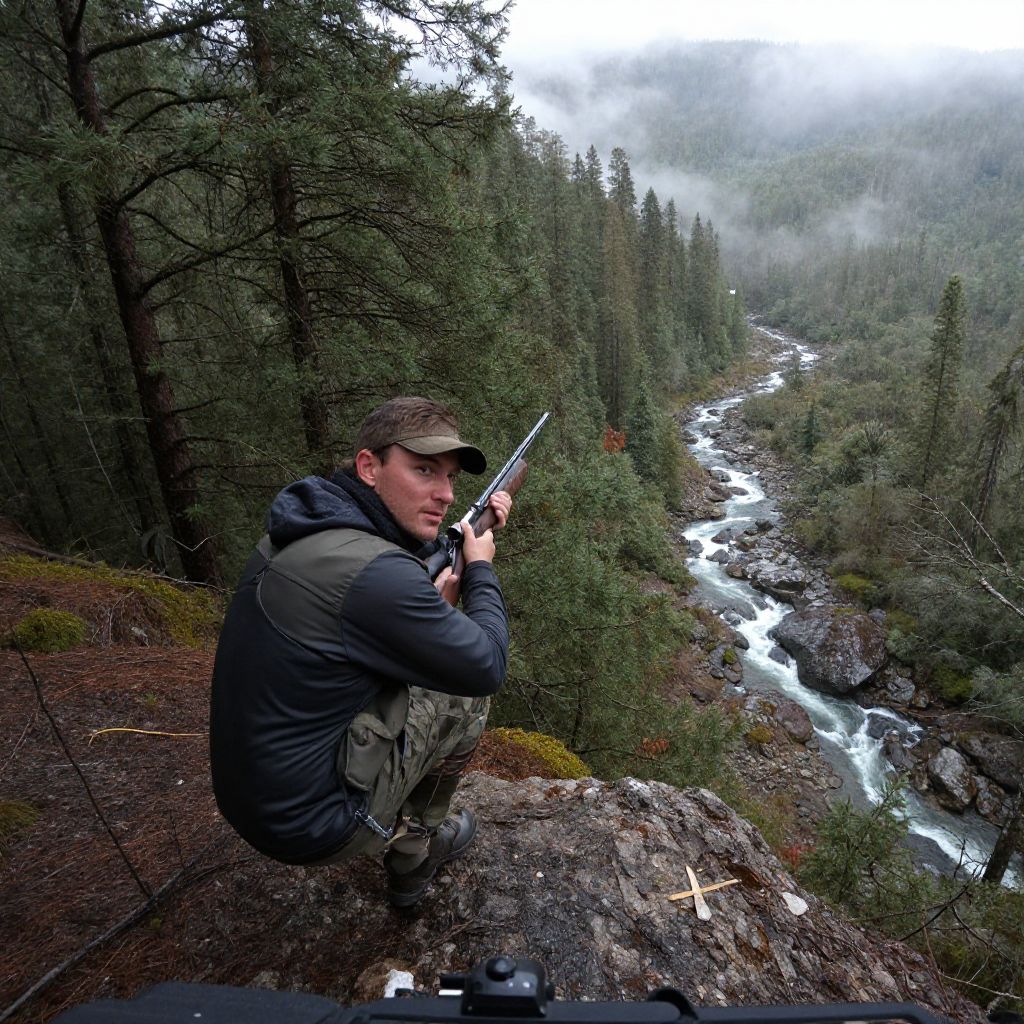 Hunter Tracking Prey Through Wilderness