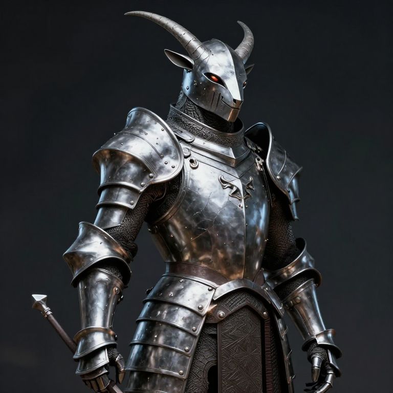Photorealistic CGI image of a standing armored warrior with a full-body suit of gleaming, polished silver steel armor. The armor has angular, modern design with intricate detailing and a high collar. The warrior's helmet has a pointed top and no visible facial features. The chest plate is large and segmented, with overlapping shoulder guards. A dark, textured cloth hangs from the waist. The background is a smooth gradient from gray to blue, emphasizing the armor's metallic sheen. The figure stands with legs apart, hands clenched, exuding a powerful, imposing presence. The image has a slightly cool color tone.