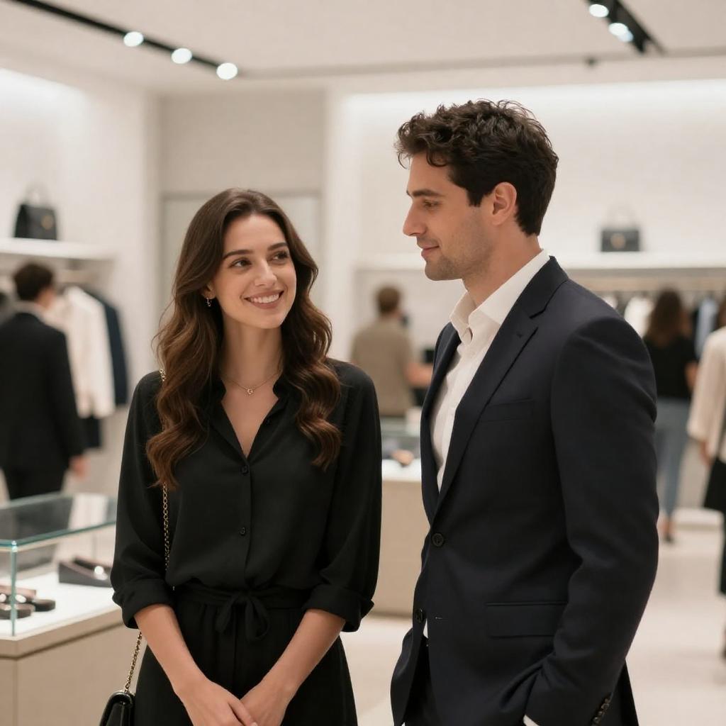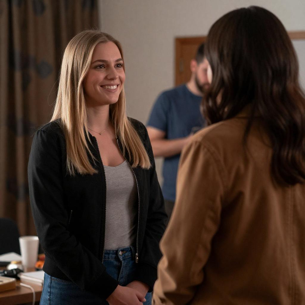 Photograph of a farmer's market. Woman with wavy brown hair, wearing a gray coat and black top, smiles at a man in a blue shirt. Man leans forward, facing her. Basket of green beans on table in foreground. Tomatoes in front. Corn stalks hang on left. Blue and red tents in background. Other people and market stalls in the background. Bright, outdoor setting. Woman's hands clasped in front. Man's face partially visible.