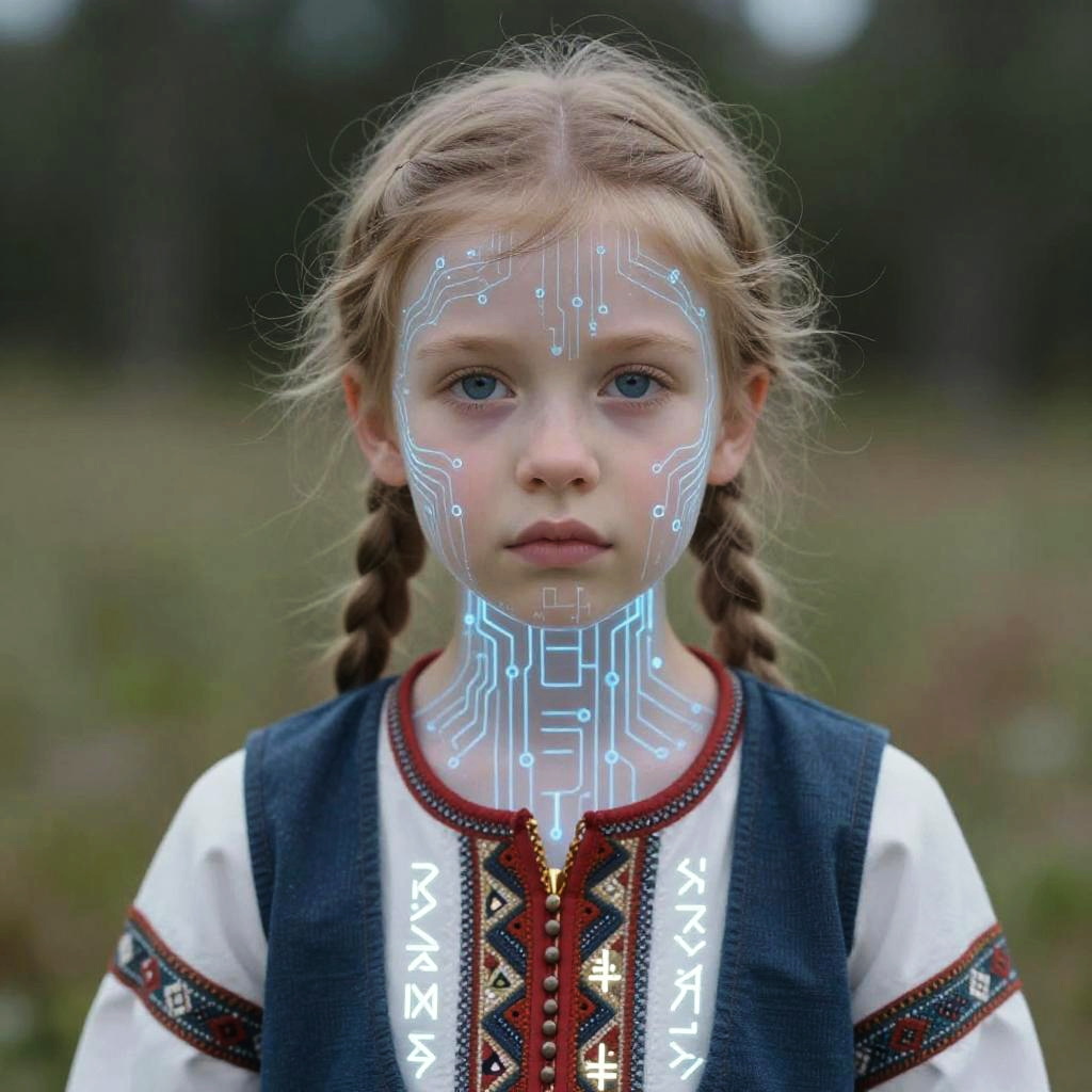 Close-up of an AI Swedish girl with ethereal features, translucent skin revealing circuits beneath, wearing traditional Swedish folk clothing with a futuristic twist, glowing runes, digital art style