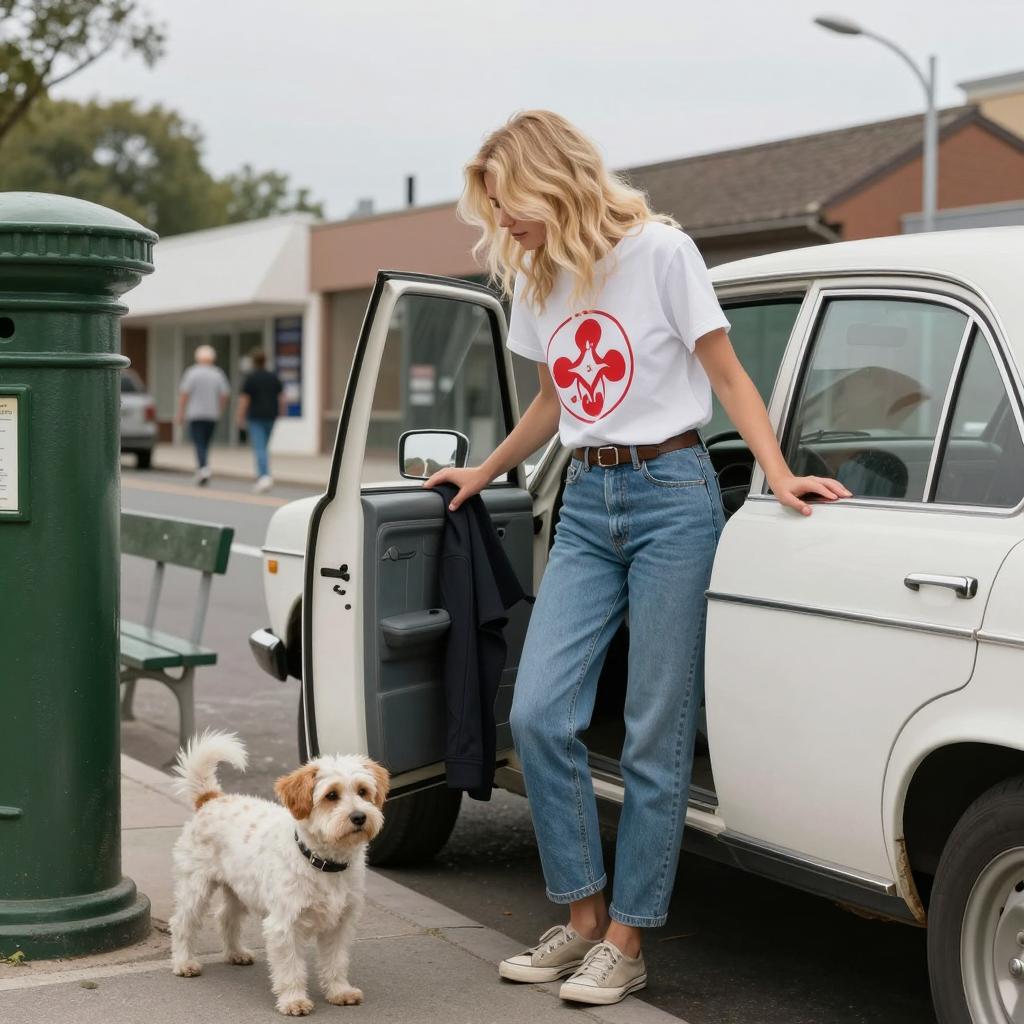 Three people and a dog standing on a wooden dock by a lake. A blonde woman wearing a denim jacket, white crochet shawl, white shirt, and brown boots stands with hands in pockets. A blonde boy in a blue denim jacket, white shirt, beige pants, and black sneakers stands nearby. Another boy in a pink t-shirt, green pants, and sneakers stands in the background. A large dog lies on the dock. The scene features an overcast sky, water, and a forested background with rusty dock equipment.