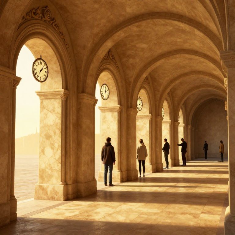 A digital rendering depicts a serene corridor bathed in golden hour lighting, featuring clock-shaped portals embedded in ornate arches, symbolizing timeless moments awaiting exploration by visitors who might emerge slightly altered.