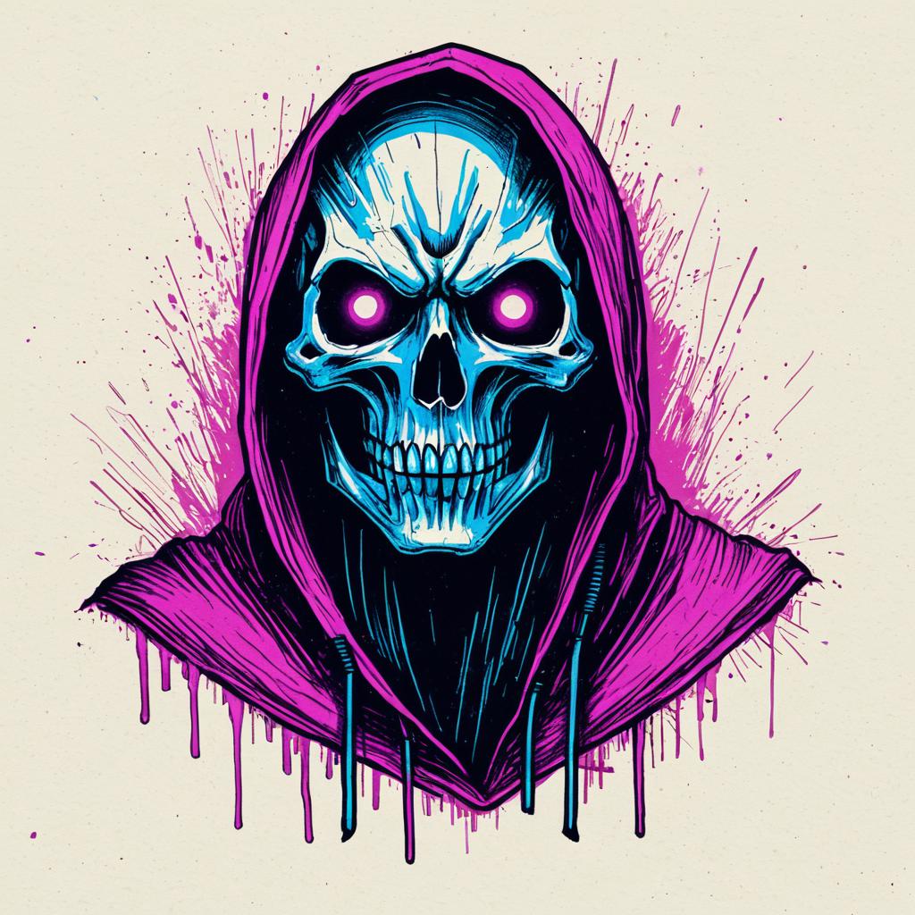 A vibrant digital illustration of a specter skull with glowing electric blue and magenta colors. The skull is wearing a magenta hood with detailed shading and dripping paint effects, set against a light background with paint splatter accents. The eyes of the skull glow with bright magenta, creating an intense and eerie visual impact.