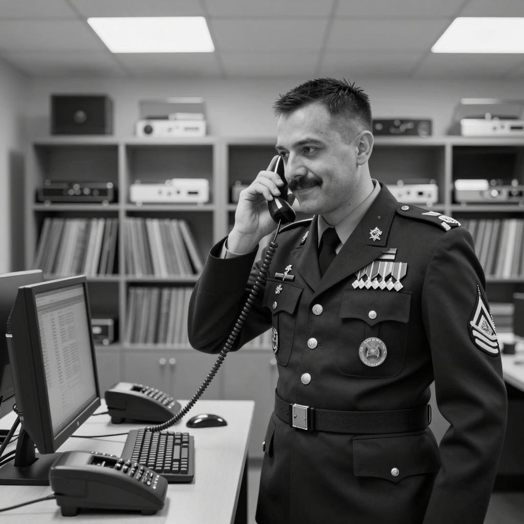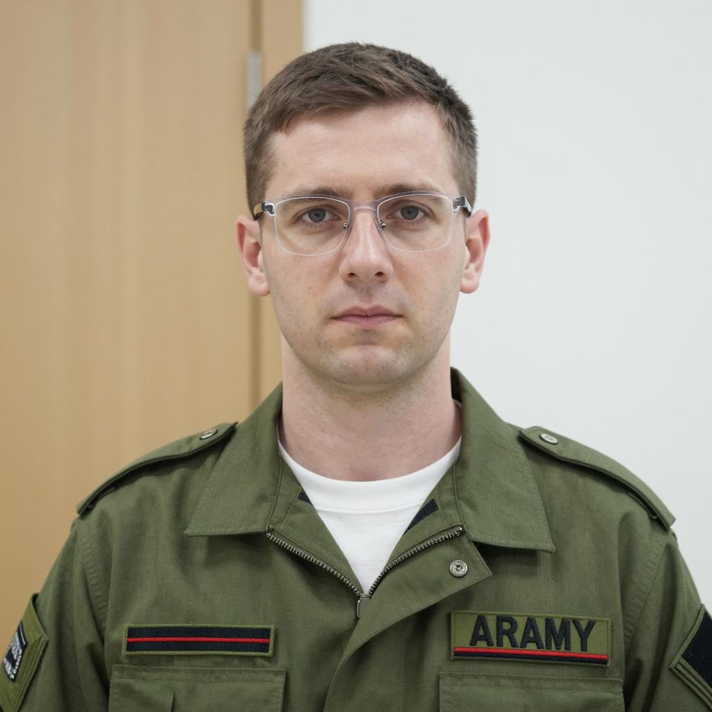A man with short brown hair, wearing clear glasses, a green military uniform with "ARMY" on the chest, and a white t-shirt underneath. His expression is neutral. Background has blurred wooden and white elements. He has a visible name tag with a red stripe.