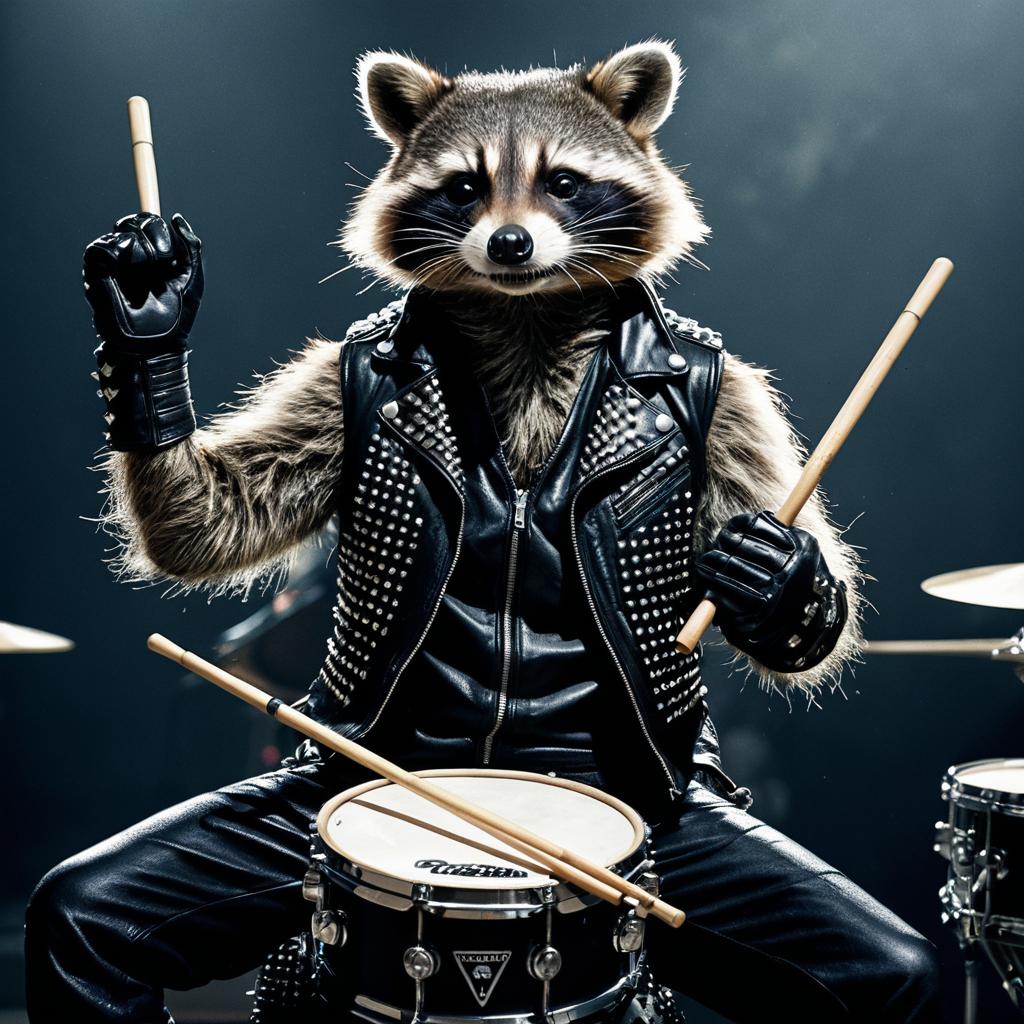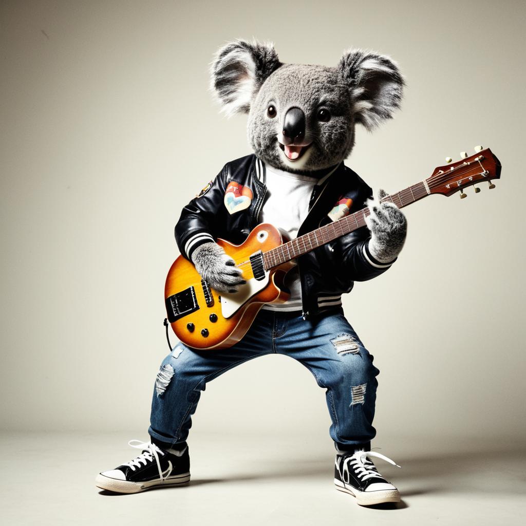 Anthropomorphic tiger depicted as a rock star, wearing a studded denim jacket and black skinny jeans, playing an electric guitar with an energetic and dynamic pose.