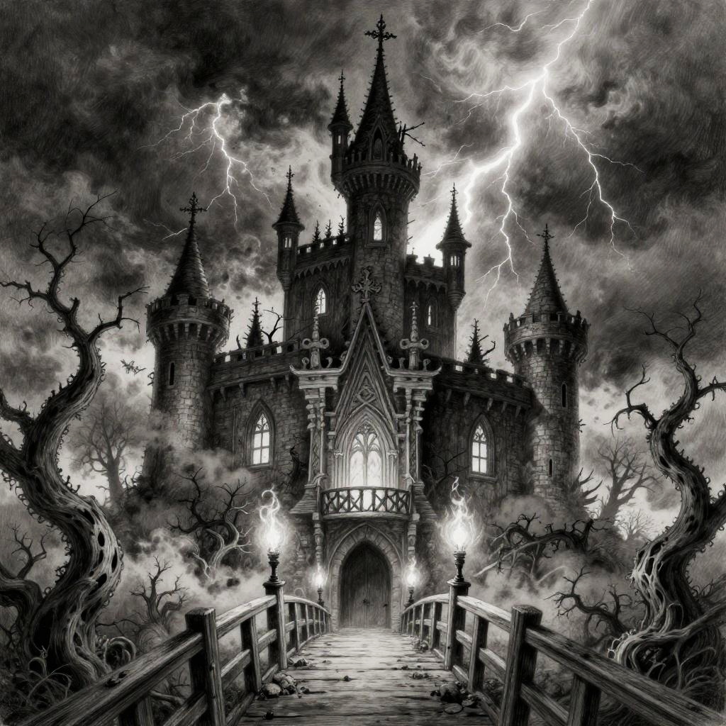 Spooky castle drawing illuminated by flickering torchlight, with jagged turrets and twisted spires reaching into a stormy night sky filled with lightning. The foreground has gnarled dead trees and a rickety wooden drawbridge, detailed in moody graphite pencil style.