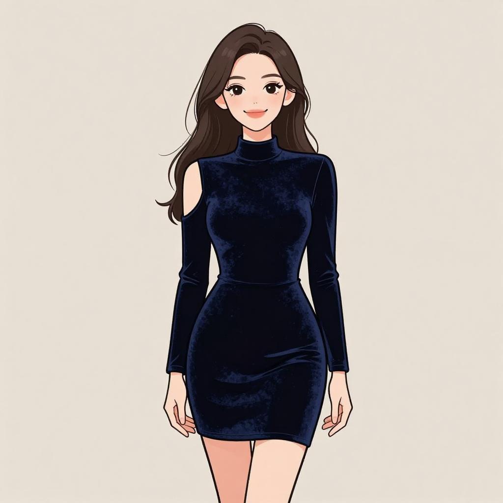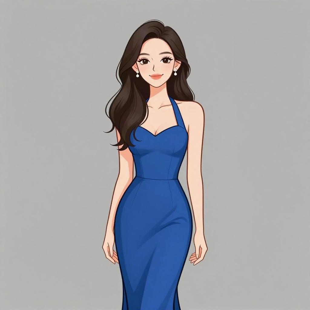 Woman with pretty face and pretty hair. smiling Woman, elegant evening, royal blue halter neck gown, form-fitting, sleeveless, slight flare at the hem, understated earrings, hair down with soft waves, plain studio background. --sref 1467