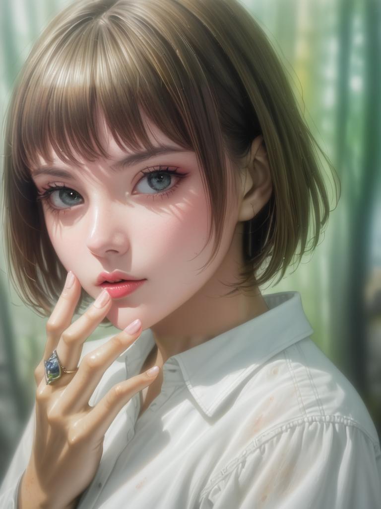 1girl, solo, realistic, photorealistic, brown hair, looking at viewer, jewelry, ring, upper body, long sleeves, lips, blurry, blue eyes, shirt, blurry background, white shirt, green eyes, nail polish, short hair, closed mouth, fingernails, traditional media