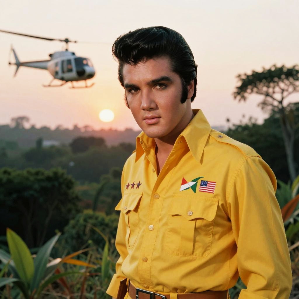 Elvis in Vietnam, vibrant 1960s military uniform, lush jungle backdrop, iconic pompadour hairstyle, vintage helicopter overhead, cinematic film style, warm sunset lighting