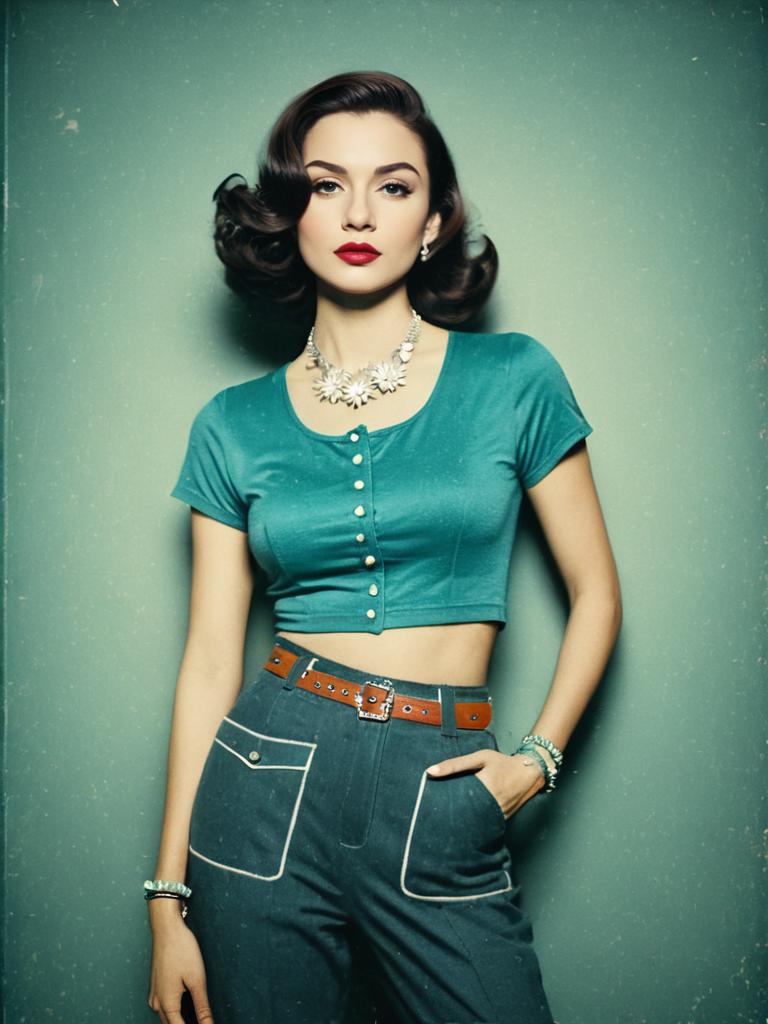 Retro Style Woman in Blue Crop Top and High-Waisted Pants