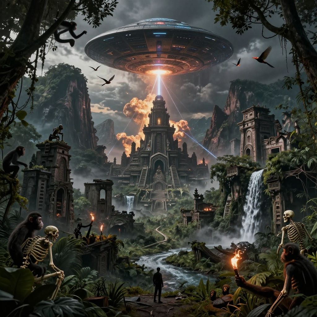 Masterpiece, ASCII, 8k.absurdes, intricate, maximum resolution, black becomes bleak, explosions on earth, dramatic sky, abandoned city in the jungle, ruins in mountains, ancient civilization, futuristic ruins, skeletons, forest, monkeys on trees, paradise birds flying, waterfall, people holding torches, laser line pierces the ufo, asymmetric composition, rule of thirds, cinematic