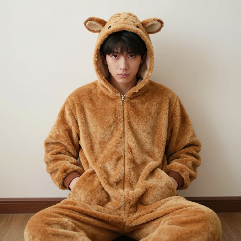 Photograph of an East Asian young man with straight black hair, sitting on a wooden floor against a plain white wall. He wears a fluffy, light brown bear onesie with a hood featuring bear ears, and his hands are in the front pockets. His expression is neutral, with slightly parted lips and large, dark eyes. The onesie is plush and textured, with a zipper running down the front. The background is minimal, emphasizing the subject. The lighting is even, highlighting the softness of the onesie's fabric and the wooden floor's grain.