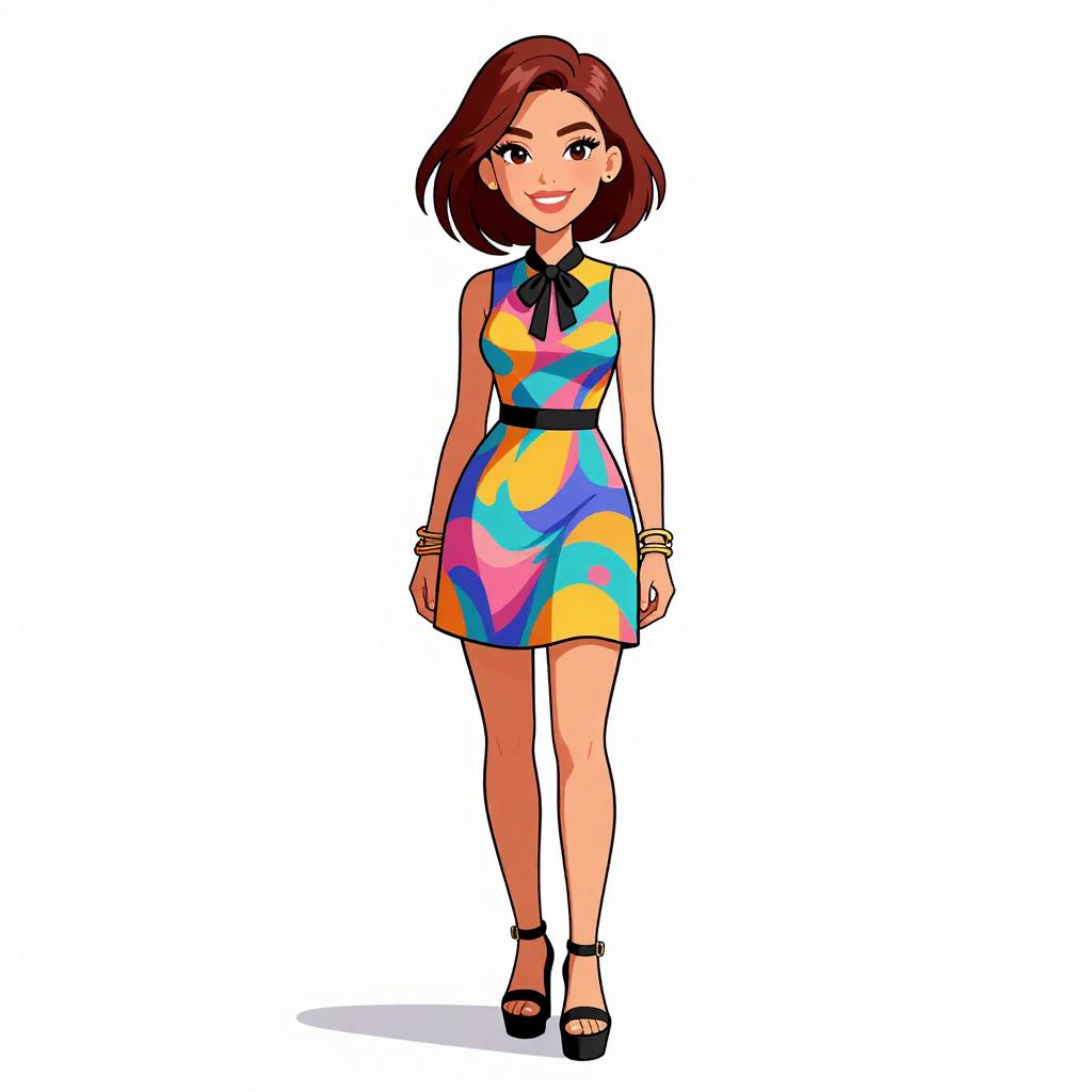 Woman with pretty face and pretty hair. smiling Woman, contemporary casual, sleeveless ombre shirtdress with gradient from light blue to pink and purple at the hem, classic collar, button front closure, cinched at the waist with a metallic belt, mid-thigh length, aviator sunglasses, contrasting turquoise ankle boots with black heels, plain white studio background. --sref 1467