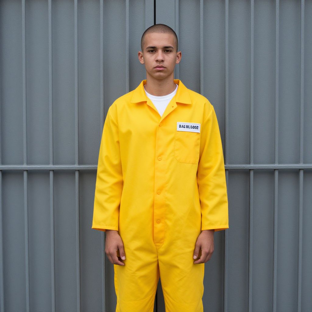Photograph of a young man with a shaved head standing in front of a gray, barred wall. He's wearing a bright yellow prison jumpsuit with a white shirt underneath and a name patch on the left chest. He has a neutral expression and his arms are relaxed by his sides. The jumpsuit and wall bars create a stark, contrasting background.