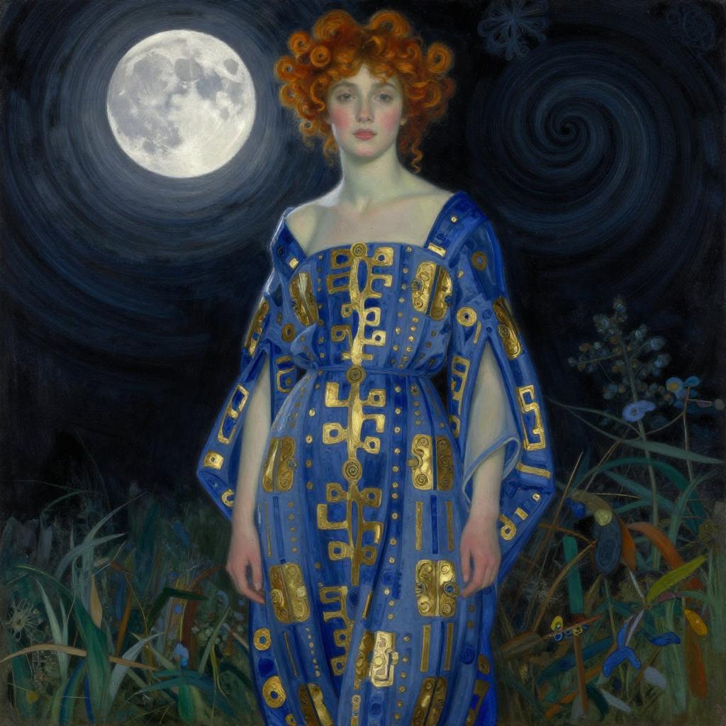 A detailed painting of a young woman with curly auburn hair wearing a flowing blue gown decorated with intricate gold patterns. She stands in front of a full moon against a dark, swirled background. The artwork is inspired by Gustav Klimt, featuring fine ornamental details and a moody, atmospheric nocturnal ambiance.