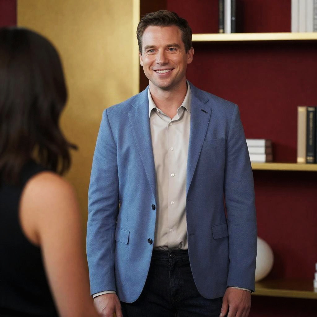 Photograph of a man with light skin and short brown hair, wearing a light purple shirt, dark vest, and plaid tie, holding a brown leather-bound book in his right hand. Blue background with white . He has a slight smile and stands with his left hand on his hip. Single microphone on the right.
