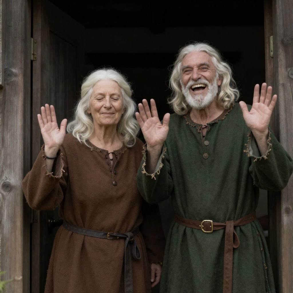 Two elderly people with wild white hair, wearing tattered brown and green medieval clothing, stand in a wooden doorway. The woman smiles with closed eyes, the man laughs with mouth open. Both raise their hands. Dimly lit background.