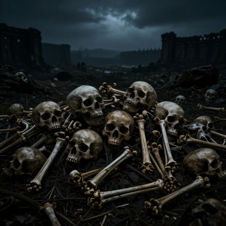 Pile of skeletons in a dark ancient battlefield, scattered bones intertwined under a gloomy sky, eerie atmosphere, cinematic lighting, detailed textures