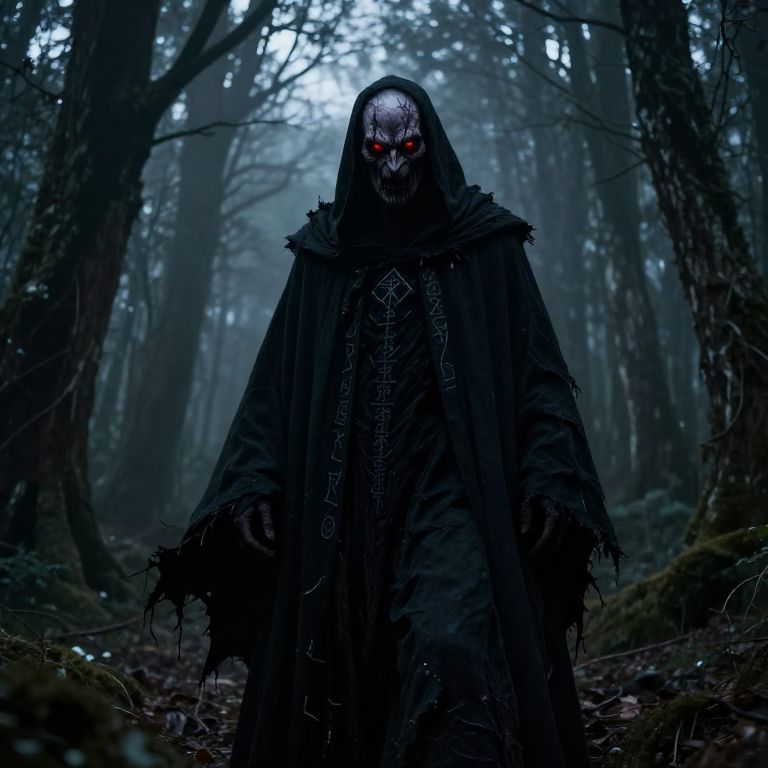 Photorealistic digital artwork of a dark, hooded figure with glowing red eyes and a skeletal face, standing in a foggy, eerie forest.