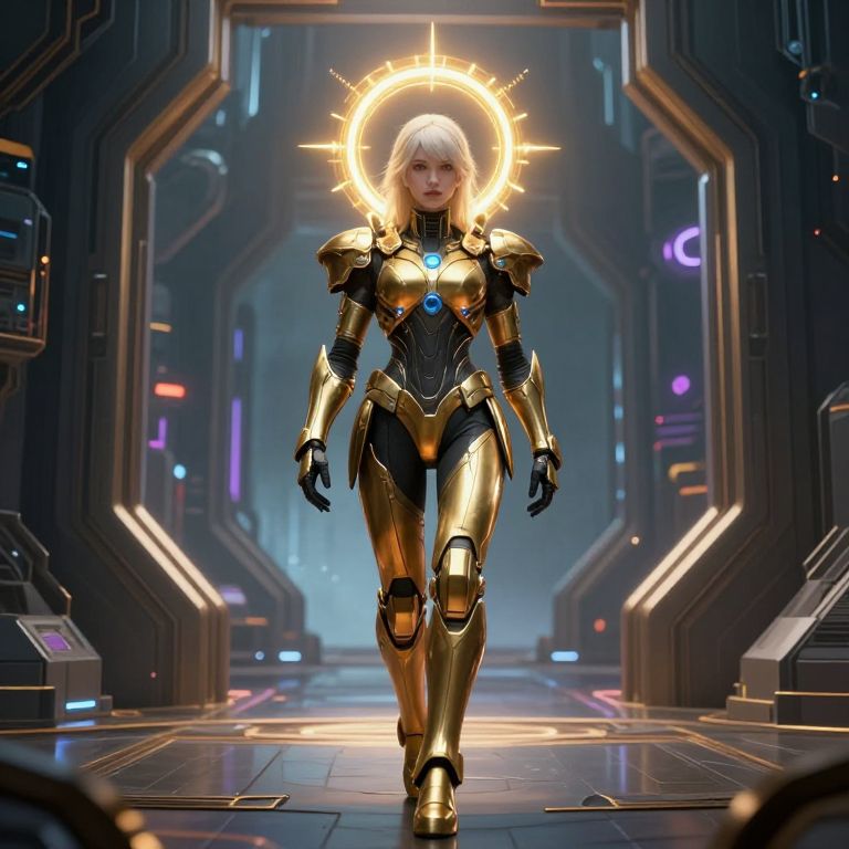 Beautiful pale girl with giant golden halo wearing power armor walks through a portal to the digital world. grand. cyberpunk scene by ralph mcquarrie and beksinski r / characterart