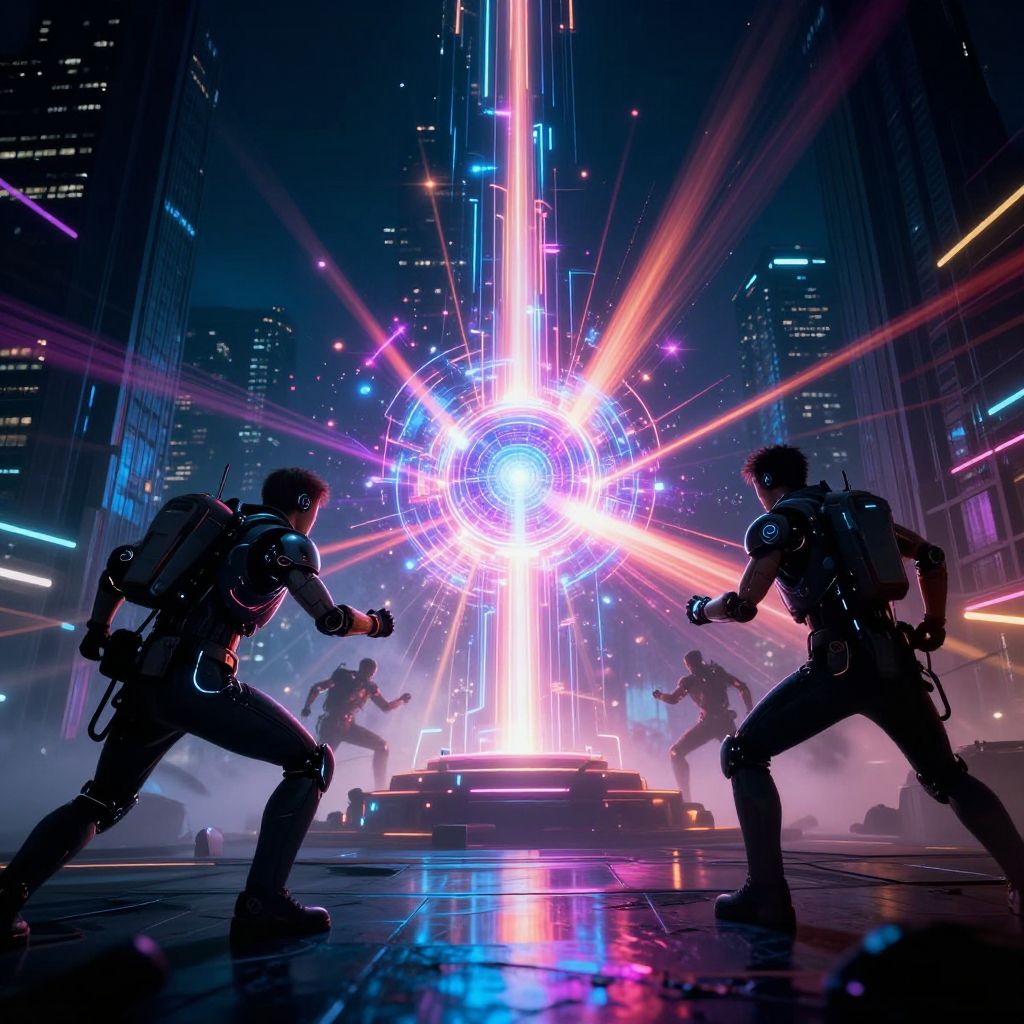 Movie poster AI inspired artwork with a dark metropolis, glowing AI core at the center emitting vibrant energy beams, cybernetic enhancements visible on characters, intense action pose framing, neon reflections, cinematic haze, ultra-detailed sci-fi atmosphere.