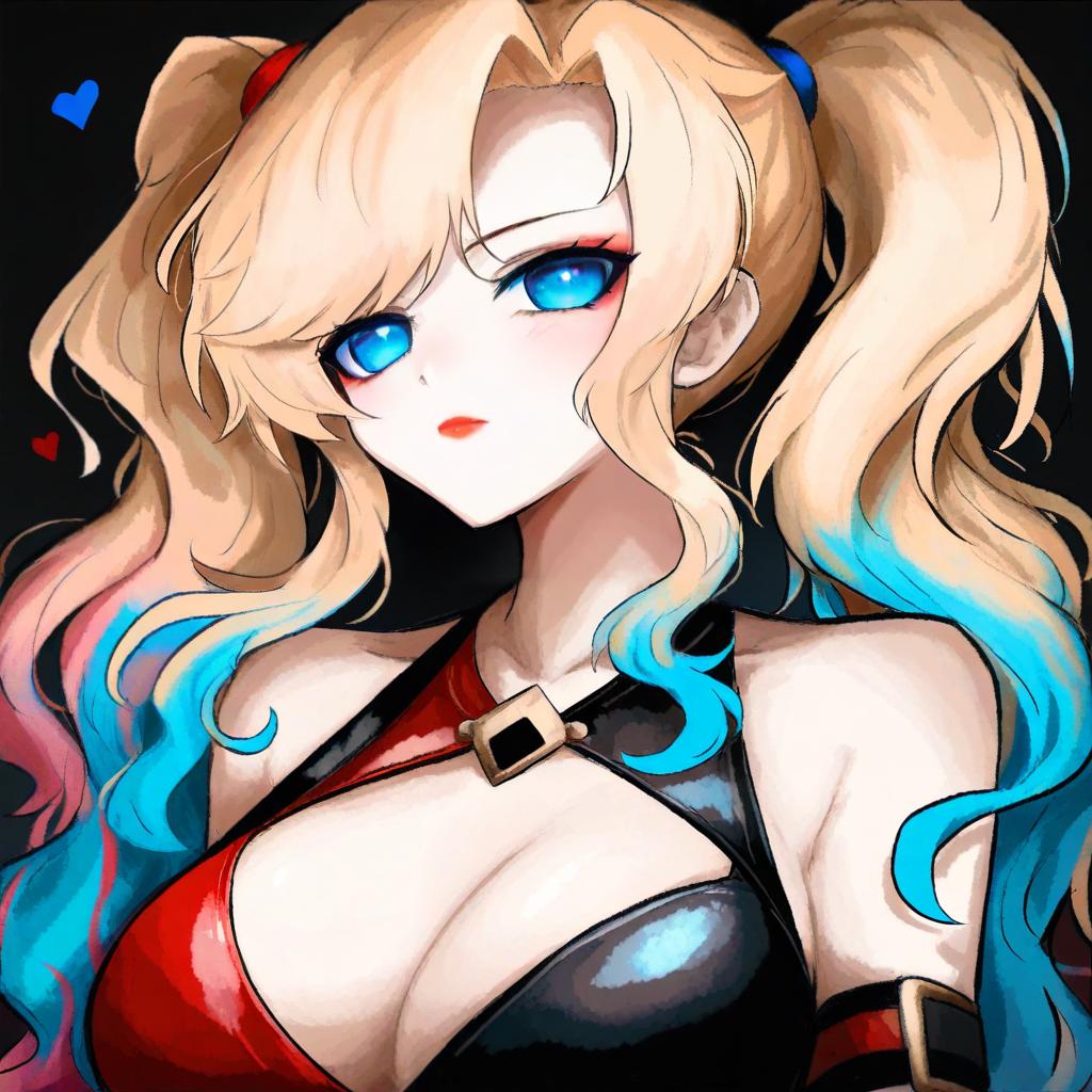Digital anime-style illustration of Harley Quinn from DC Comics. The character has blonde, blue, and pink gradient twintails, bright blue eyes, red lips with lipstick, and is wearing a red and black leather outfit. The image emphasizes a stylized, vibrant color palette with detailed hair and facial features.