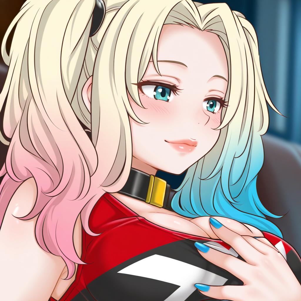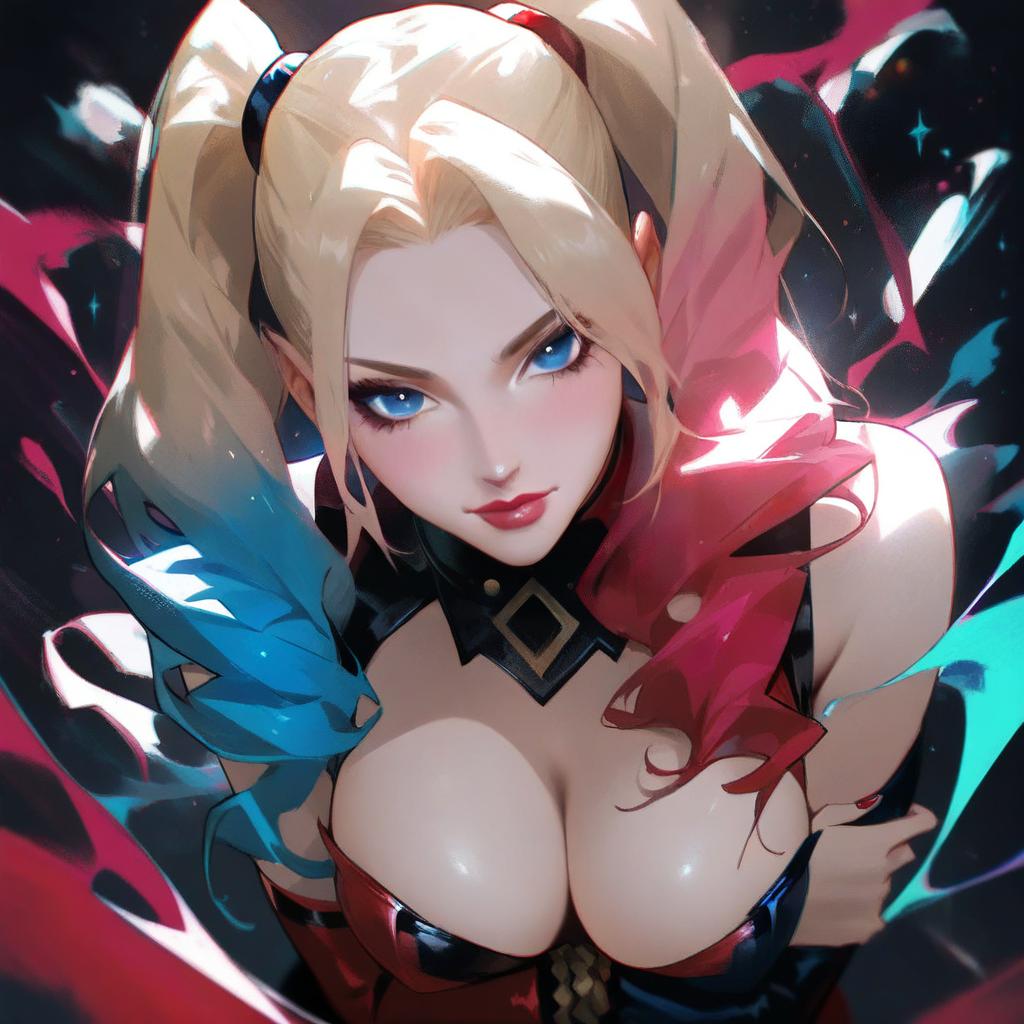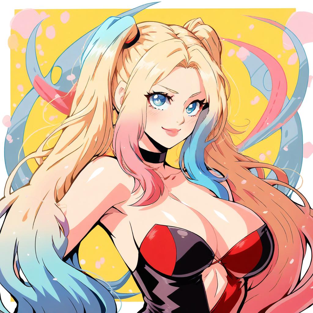 Harley quinn, dc comics, 1girl, red lips, blue eyes, blonde hair, blue hair, long hair, pink hair, gradient hair, twintails, large breasts, medium breasts, nail polish, lipstick, by artist heripantomorrow, animagine
