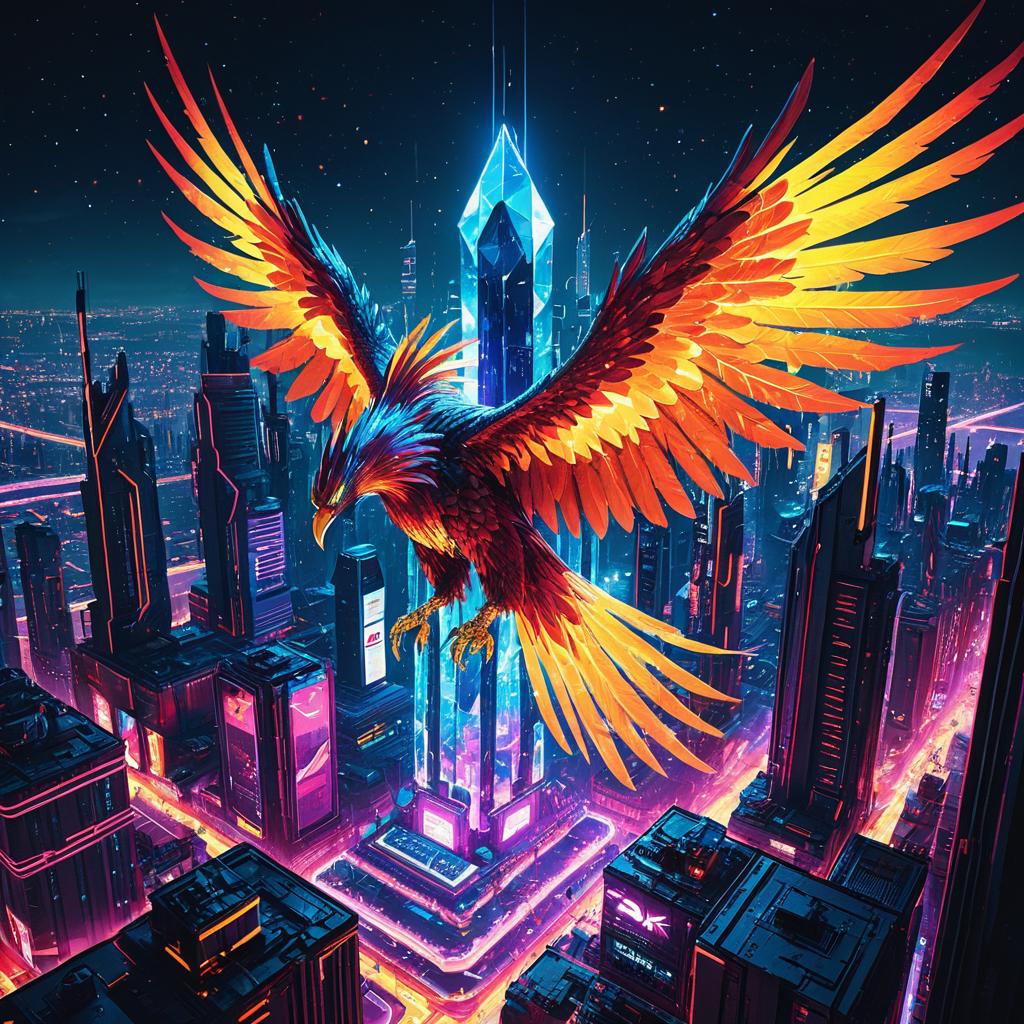 An expansive concept illustration of gigantic crystal phoenix soaring above neon-lit cyberpunk cityscape at night, ultra-photorealistic digital painting with hyper detail and vibrant color palette, style by Beeple and Syd Mead, Octane render, 8K resolution, cinematic global illumination.