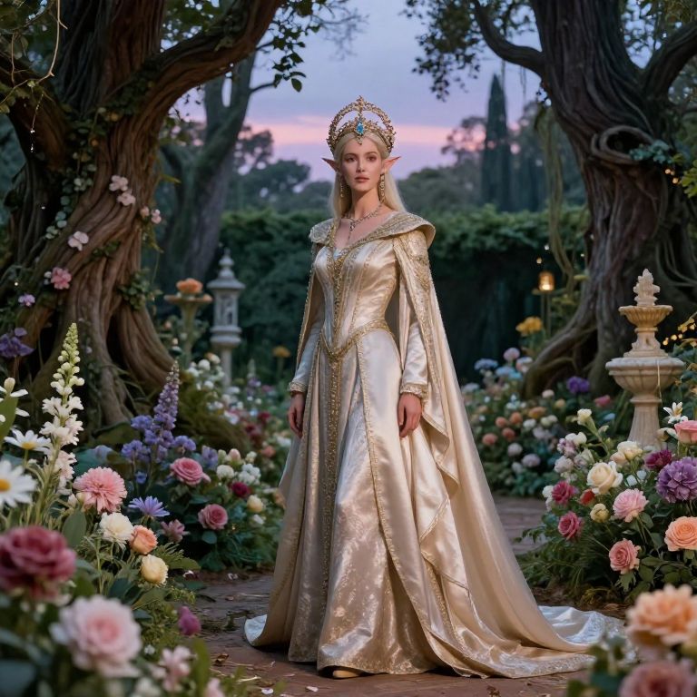 Half elf noble in lavish forest palace garden, adorned with jeweled circlet and flowing silk garments, surrounded by blooming flowers and ancient trees under twilight sky.
