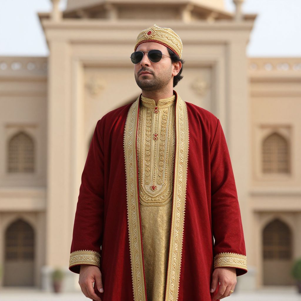 Photograph of a Middle Eastern man standing in front of a beige, ornate building with arched windows. He has a medium build, light brown skin, and short black hair with a beard. He wears dark sunglasses, a gold embroidered red robe, a matching gold tunic, and a red and gold headscarf with a central emblem. His robe has intricate gold patterns on the edges and cuffs. The background building features detailed stone carvings and is slightly out of focus, emphasizing the man's attire. The image has a warm, slightly overexposed color tone.