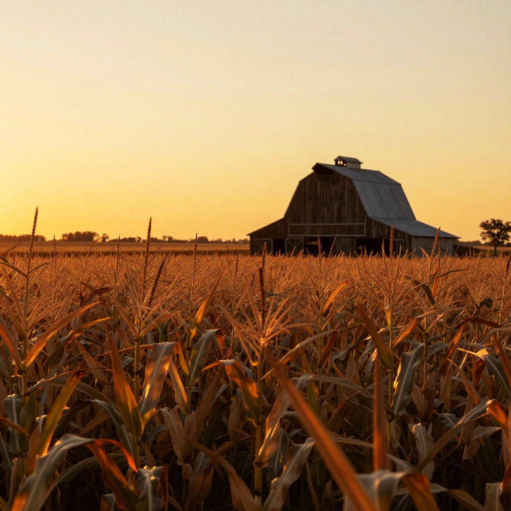 Cornhusker at sunset in a vast golden cornfield, rustic barn in the background, warm hues of orange and yellow, detailed texture of cornstalks blowing in the breeze, rural Midwest atmosphere, cinematic lighting, high resolution