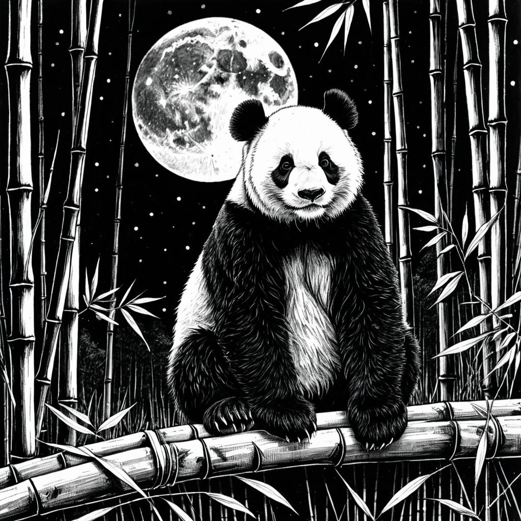 A stylized black and white illustration of an otter standing on a patterned platform floating on a river under a full moon in a starry night sky. The surrounding scene includes detailed plants and grass along the riverbanks with artistic swirling water patterns reflecting the otter and moon.