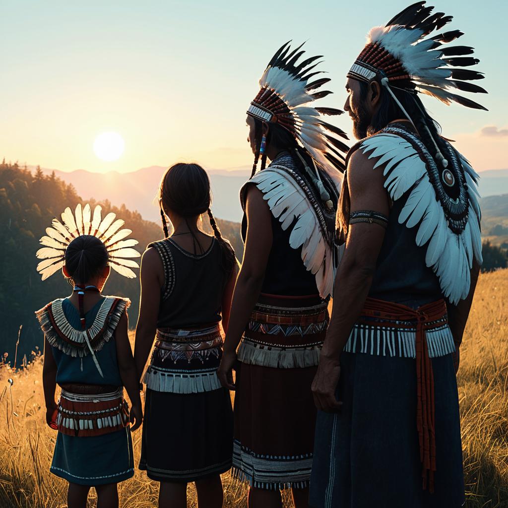 A highly detailed portrait of a grizzled indigenous family standing with their backs turned, looking out at the sunrise. The family members wear feathered headdresses and traditional clothing with intricate beadwork and patterns. The scene includes warm, radiant light illuminating the detailed natural environment of rolling hills and trees in the background, evoking a serene and respectful moment.