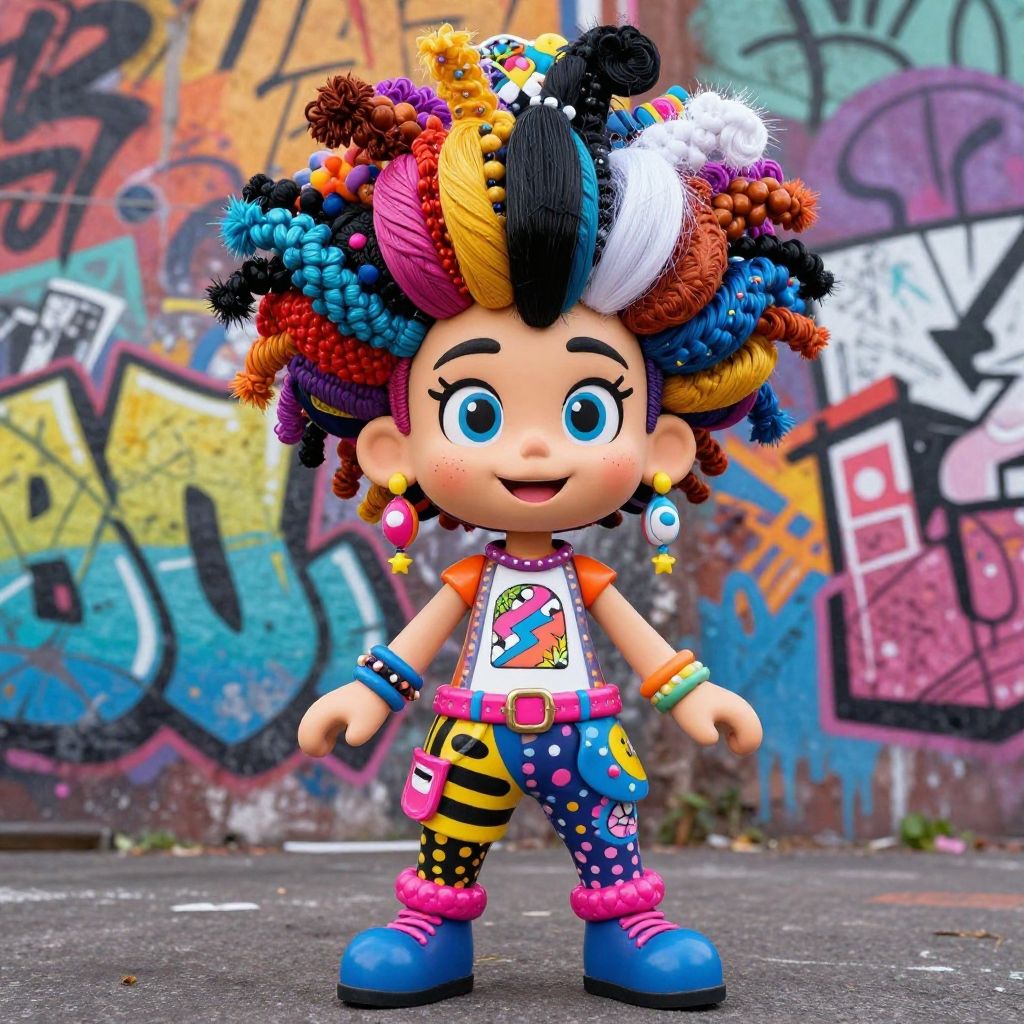 Pepper Ann costume featuring signature hairstyle and eclectic mix of patterns, whimsical cartoon style, urban street art backdrop with graffiti, colorful and energetic composition, exaggerated proportions, vibrant and detailed character design
