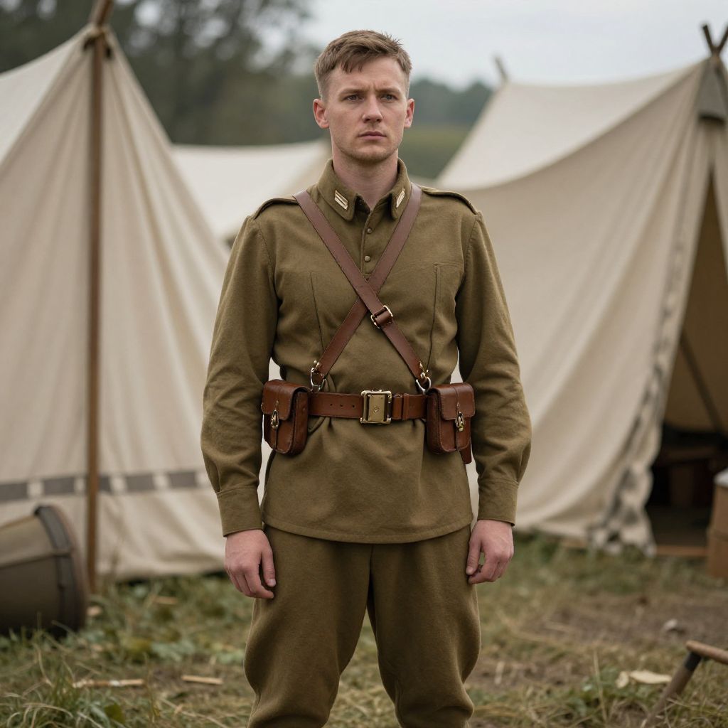Photograph of a young, fair-skinned Caucasian man with short, light brown hair, standing in front of beige military tents. He wears a green British World War II-era military uniform with brown leather straps and a belt, and has a serious expression. The uniform has buttons and pockets, and his trousers are matching green. In the background, the tents are slightly blurred, with one having a rolled-up side and another featuring a dark brown strap. The ground is grassy with scattered leaves, and the overcast sky suggests a cloudy day. The image has a realistic, historical style.