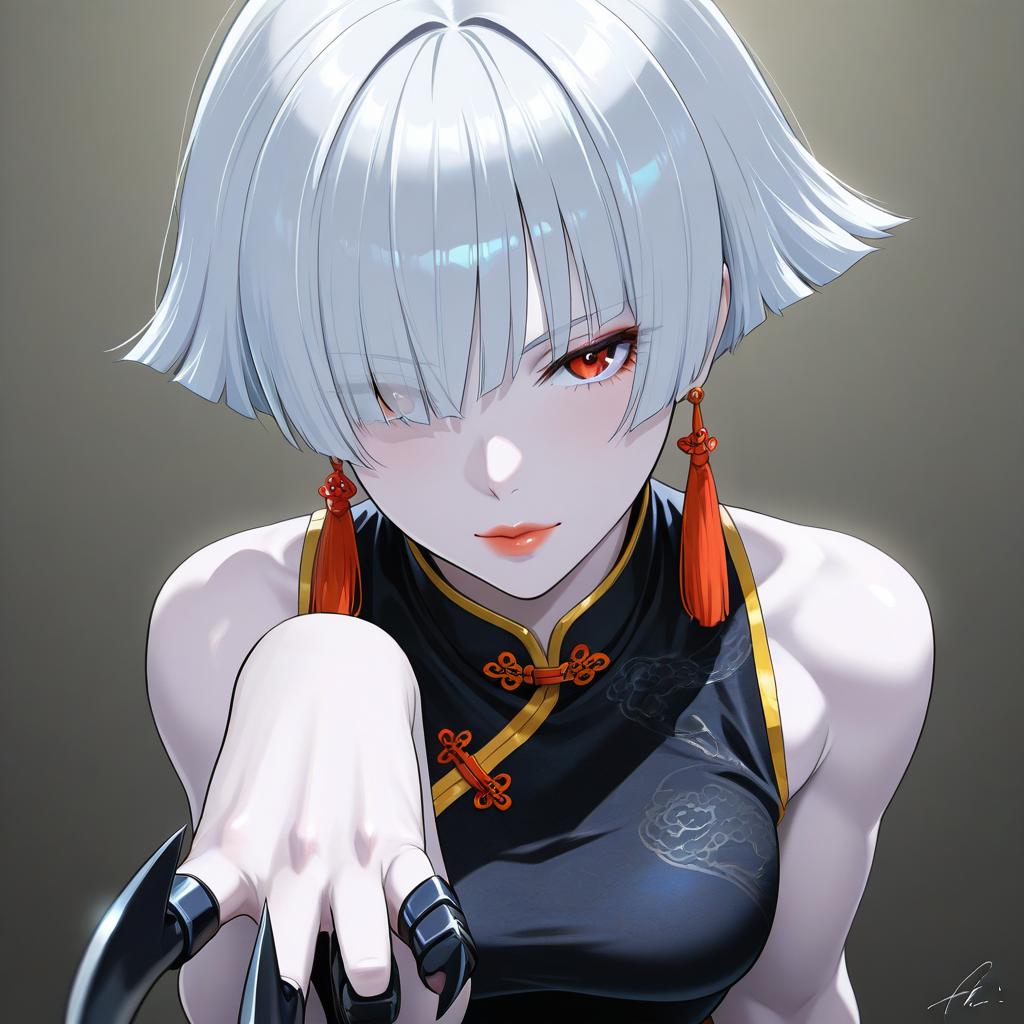 Illustration of a pale-skinned anime girl with short white hair partially covering one eye, red eyes, and red lips. She is wearing a traditional black Chinese qipao with gold trim and orange tassel earrings. The girl is depicted with claw rings on her fingers, posed with an extended hand. The background is neutral gray, emphasizing the character's features and attire.