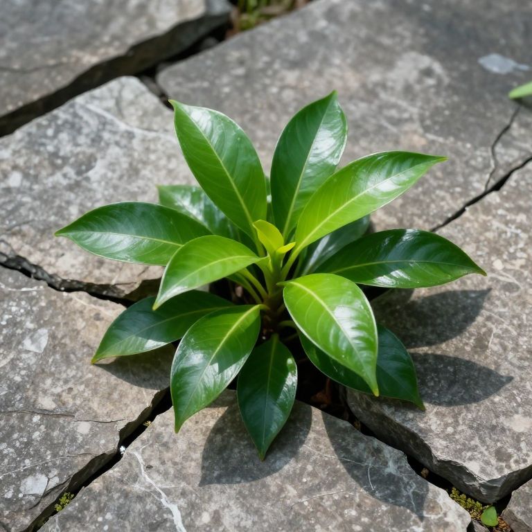 A vibrant green plant emerges defiantly from a fragmented stone slab, its glossy leaves mirroring not the mundane world but a hidden realm of infinite possibility, where light and shadow dance in perfect harmony.