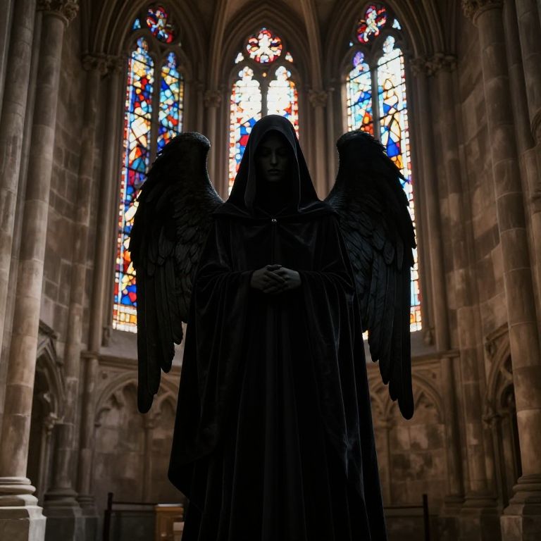 Photograph of a dark, hooded angel statue with large wings, standing in a dimly lit, Gothic-style cathedral with vibrant stained glass windows in
