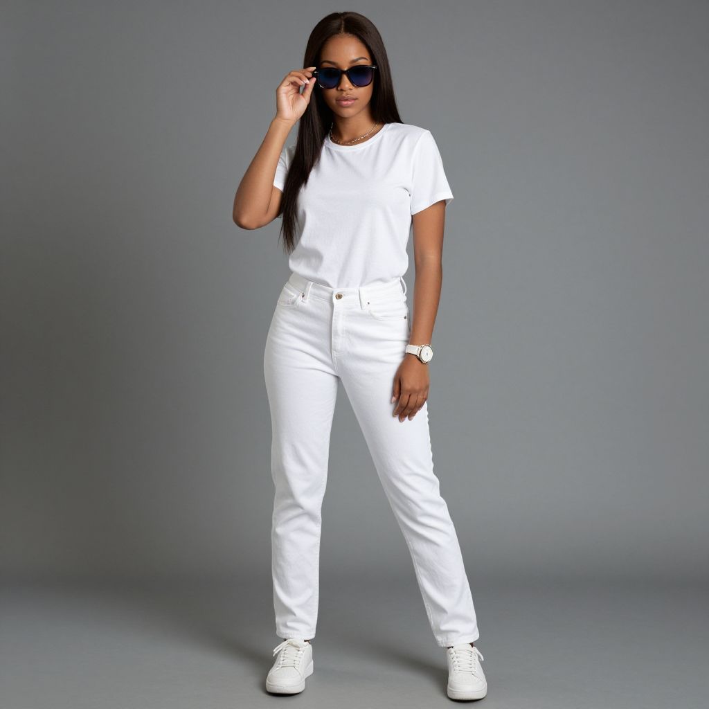 Adult pop party costume, solo, pants, shirt, full body, white shirt, dark skin, shoes, jewelry, sneakers, standing, sunglasses, watch, brown hair, long hair, 1girl, wristwatch, tinted eyewear, t-shirt, jeans, white pants