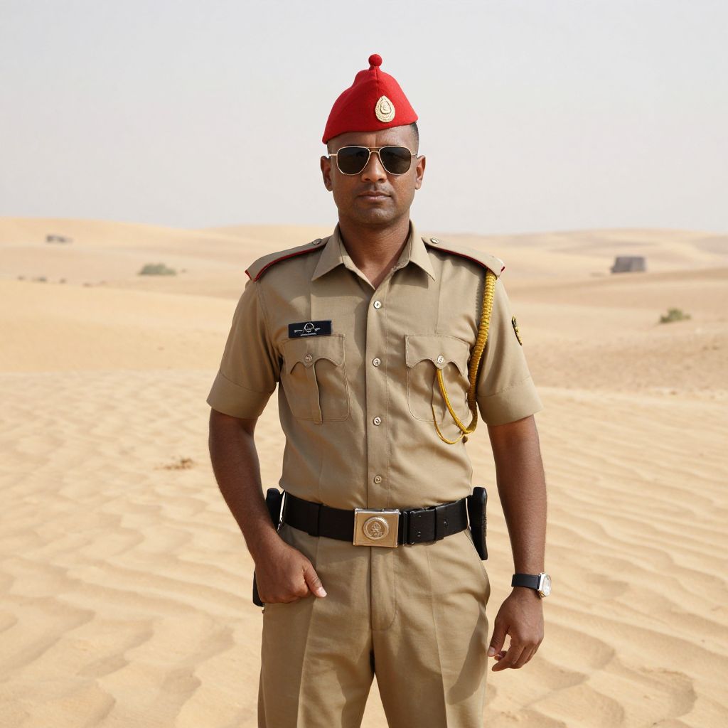 Photograph of a serious male police officer in tan uniform, red beret, sunglasses, and desert background with sandy dunes.