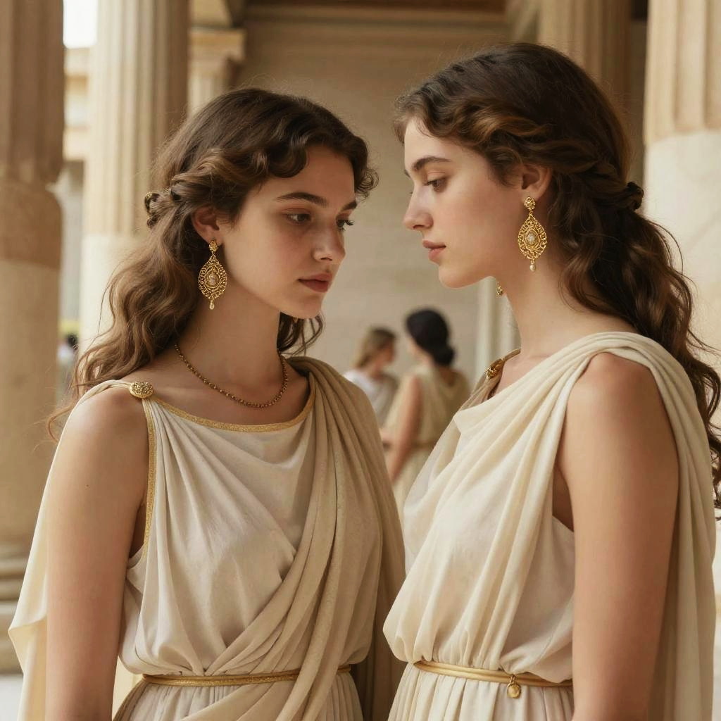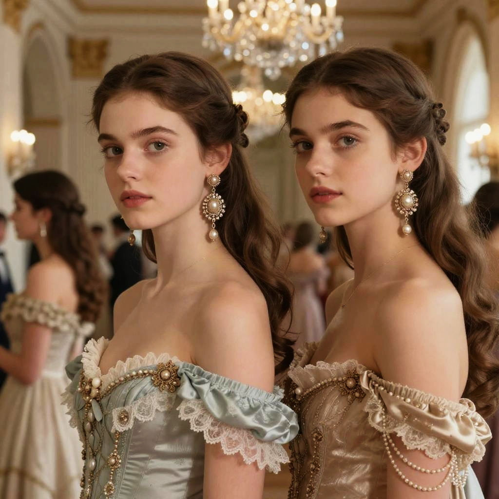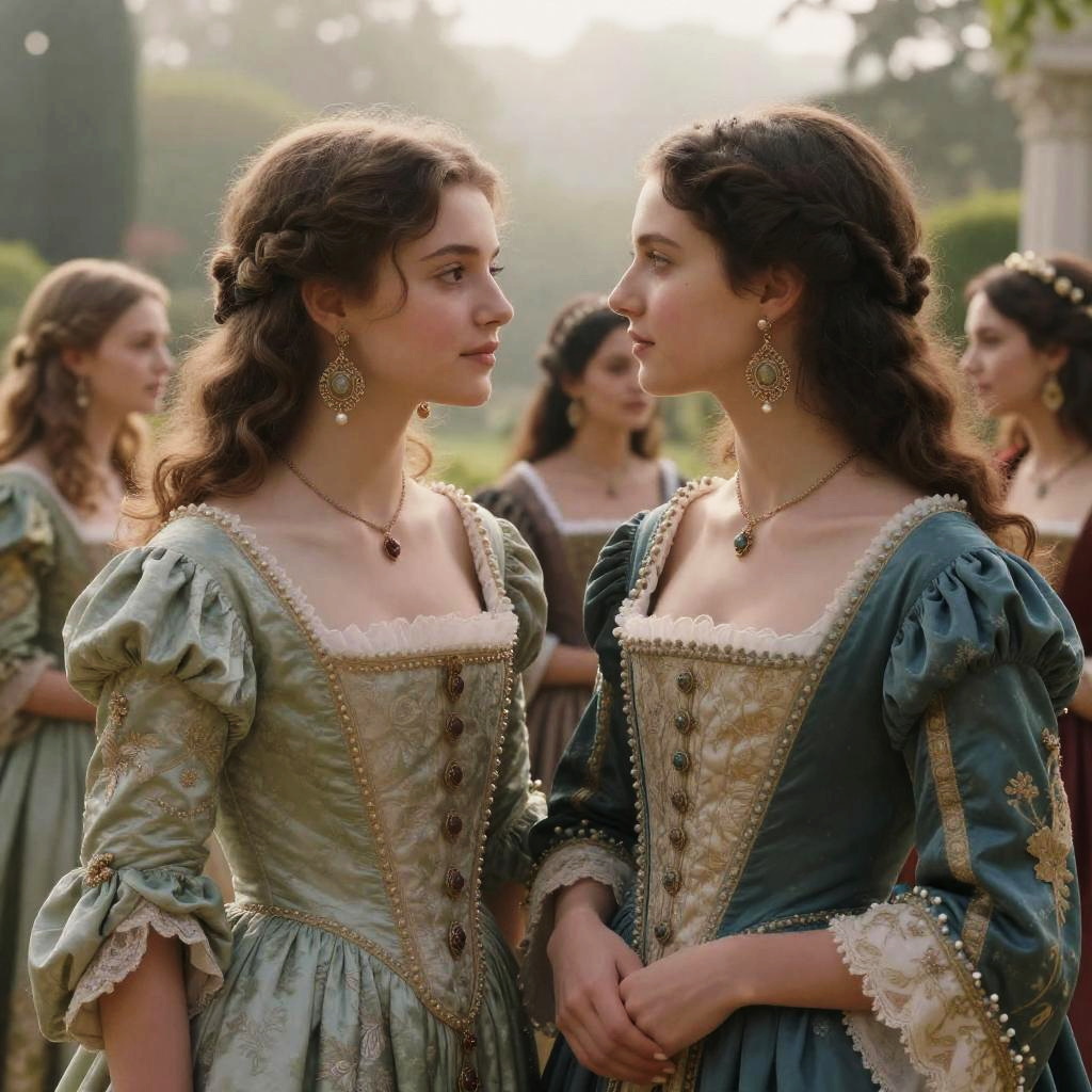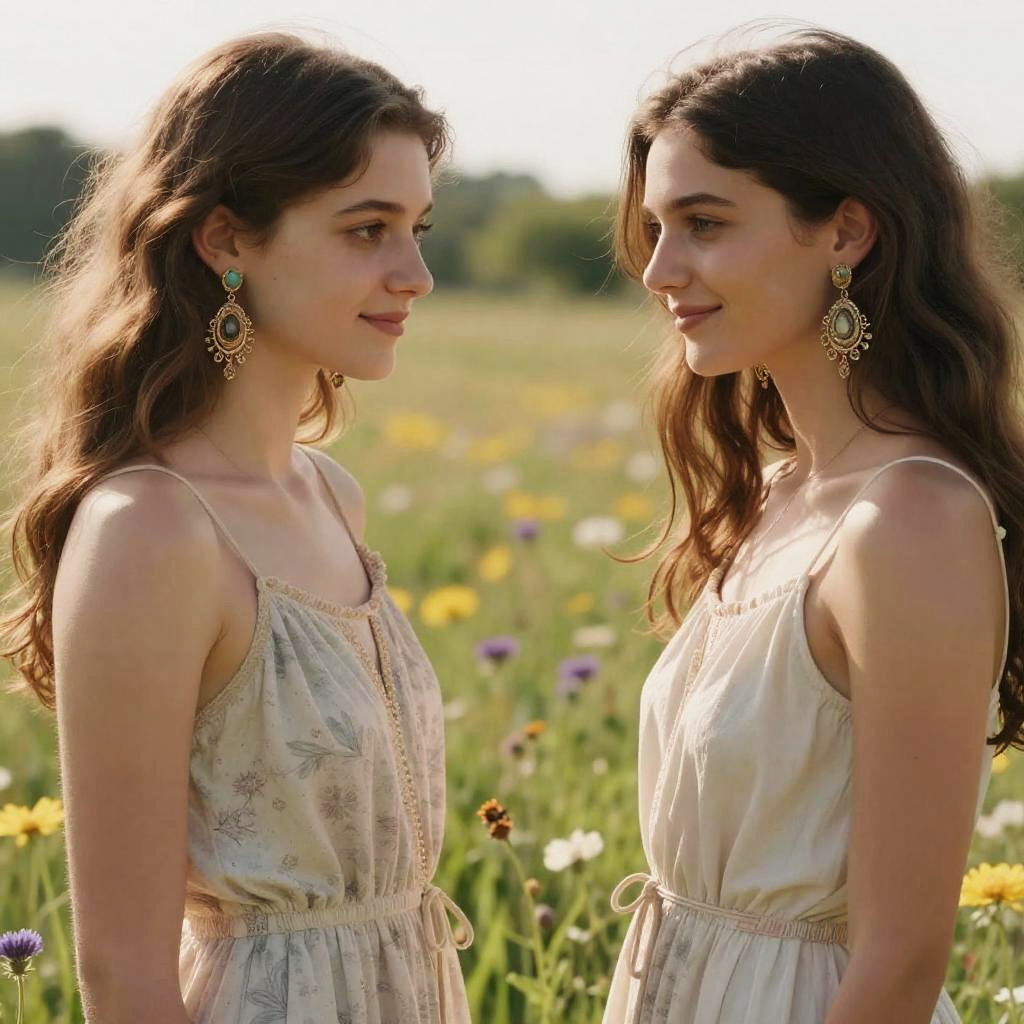 Realistic style, multiple girls, 2girls, seamless realism, soft lighting, soft brown hair, natural appearance, harmonious setting, elegant jewelry, ornate earrings, intricate detail, rich texture, expressive anatomy, lifelike appearance, ethereal charm, graceful elegance, Amazonian attire, enchanted forest, dramatic chiaroscuro, serene tranquility