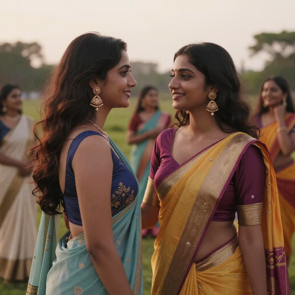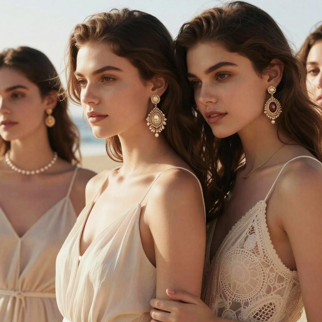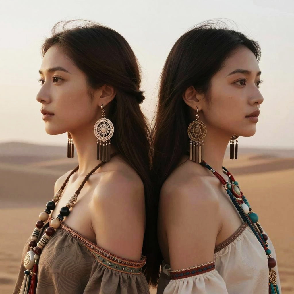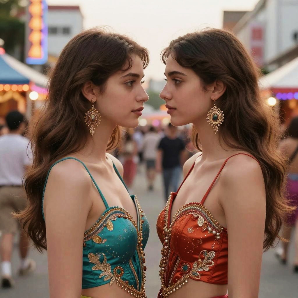 Realistic style, multiple girls, 2girls, seamless realism, soft lighting, soft brown hair, natural appearance, harmonious setting, elegant jewelry, ornate earrings, intricate detail, rich texture, expressive anatomy, lifelike appearance, ethereal charm, graceful elegance, Amazonian attire, enchanted forest, dramatic chiaroscuro, serene tranquility