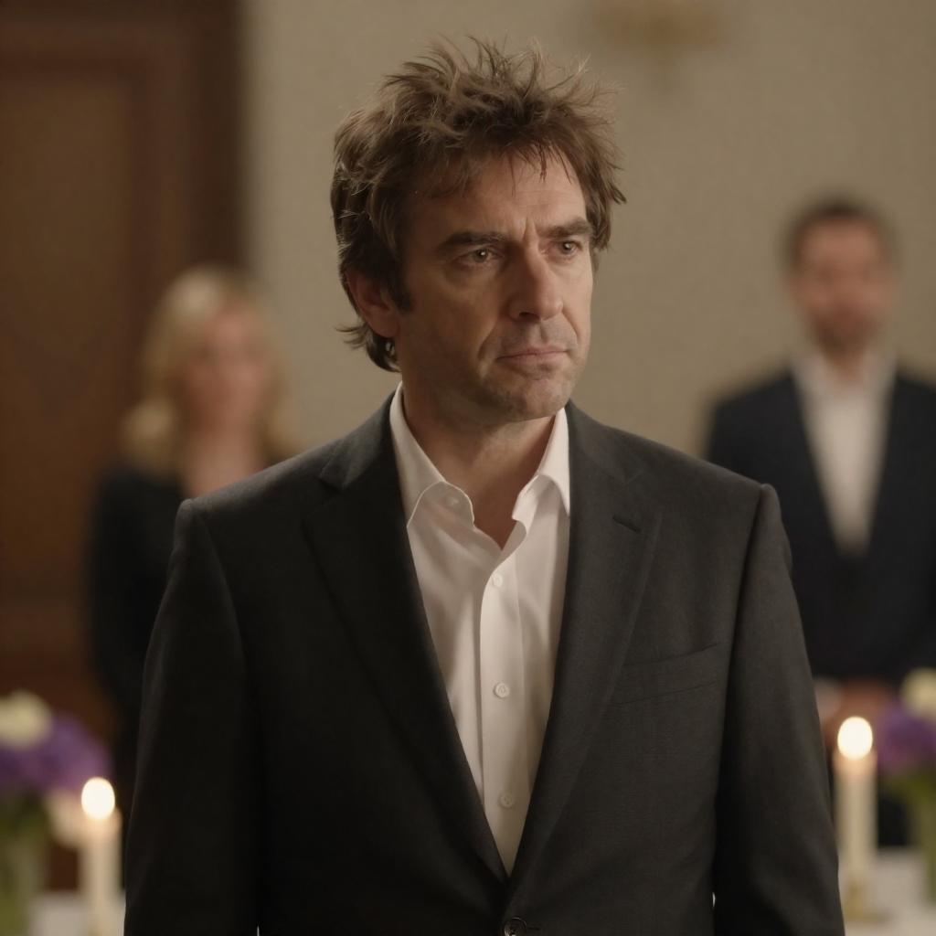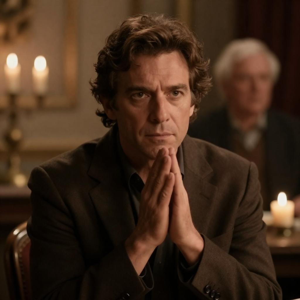 Middle-aged man with medium-length, wavy brown hair, wearing a black clerical collar, standing in a dimly lit church. Background shows wooden pews and a person lying on a pew with a green blanket. Man's expression is somber. Church interior with warm lighting, stone walls, and wooden furniture.