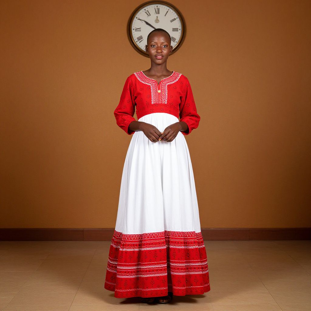 "Tswana Lobola Dress, woman in a red and white dress standing in front of a clock"
