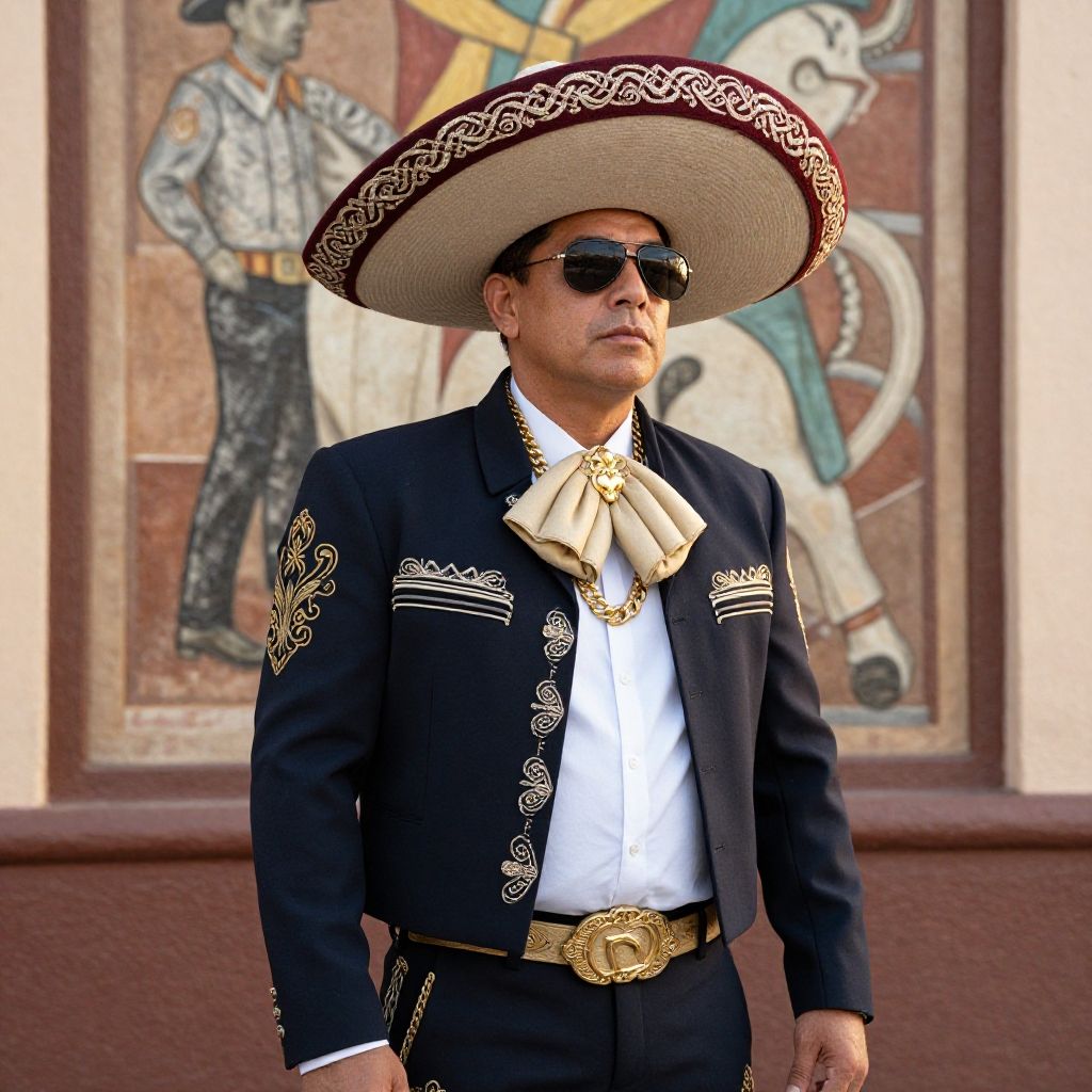 Male Mexican gangster outfit with traditional sombrero, embroidered charro jacket mixed with modern streetwear elements, gold chains, dark sunglasses, standing in front of vintage mural, warm sunset lighting, combination of historical and contemporary style elegance.